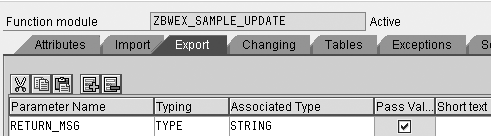 Next, click on the Export tab and define the RETURN_MSG parameter as shown in Figure 5. The system uses this parameter to send a success or failure message back to the calling application (Visual Composer, in this example) based on what occurs when the customer service representative requests a change. The function module ZBWEX_SAMPLE_UPDATE returns a success message (Successfully Updated) when the update is completed successfully. Otherwise it returns an error message (Error Occurred).