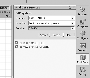Next, find the function modules that you created, ZBWEX_ SAMPLE_GET and ZBWEX_SAMPLE_UPDATE. Select Find Data from the toolbar on the far right to bring up the Find Data Services screen (Figure 6).