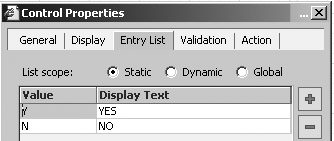 To change the field to a drop-down list, double-click on the I_DNC field in Figure 8. In the Control Properties screen that appears, change the Control type to Drop-down List and then click on the Entry List tab. Select Static and then click on the plus icon (Figure 9). The Value field contains the data that the system submits to the function module. The Display Text field contains what the user sees in the drop-down menu. Click on the Close button when finished.
