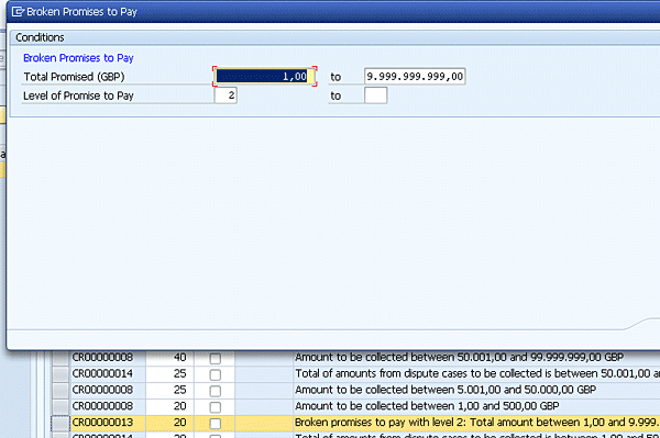 In this example, the prerequisite is that if a promise-to-pay has been broken twice within the value range of the total promised based on the condition record. Further, you can see in the highlighted line in Figure 6 that this line has a score of 20 in the collection strategy. Breaking a promise implies that the customer is less likely to pay, and as such the score should be higher. The value is also important — breaking a promise to pay $75,000 is obviously much more important than breaking a promise to pay $100.