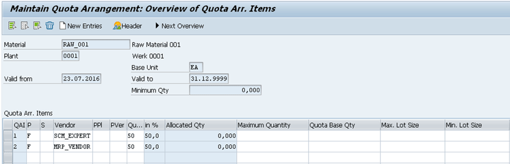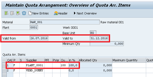 In this case, the quota arrangement can be used to replace the source list functionality and prioritize a certain source of supply over a specific period. As you can see in Figure 6, the quota arrangement has been used to allocate 100 percent of the quota to the supplier PLANT_0001 between 20.07.2016 and 31.12.2016.