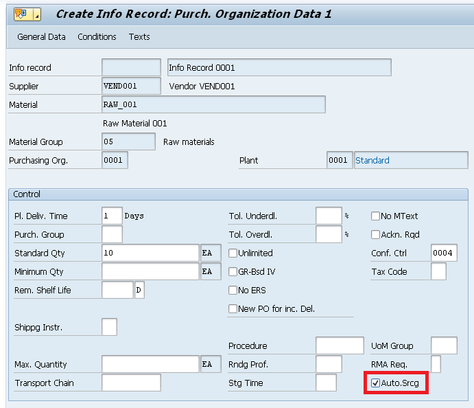One additional feature is that the Info Record provides fields in which you can define a maximum and a minimum quantity and those limits are now considered during source determination. For example, if a maximum quantity of 100 EA was defined on the Info Record, this vendor will not be selected by MRP to create purchase requisitions with more than 100 EA.
