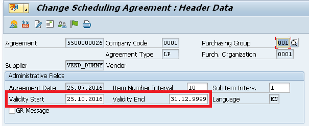 The main concern regarding the source determination with scheduling agreements or contracts is to ensure that they are within the validity date so that they can be selected by MRP. Figure 8 shows the scheduling agreement validity.