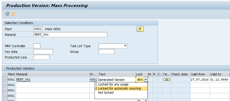 Since MRP always reads the production versions to determine a valid BOM, a new option for locking is available in the production version. While in SAP ERP you can only define that the production version is locked for any usage, in SAP S/4HANA you can also define that it is only locked for automatic sourcing, as you can see in Figure 11 after you execute transaction code C223. With this locking option you can avoid the production version to be selected by MRP, but it can still be used to create a production order or even for costing.