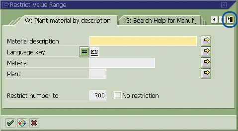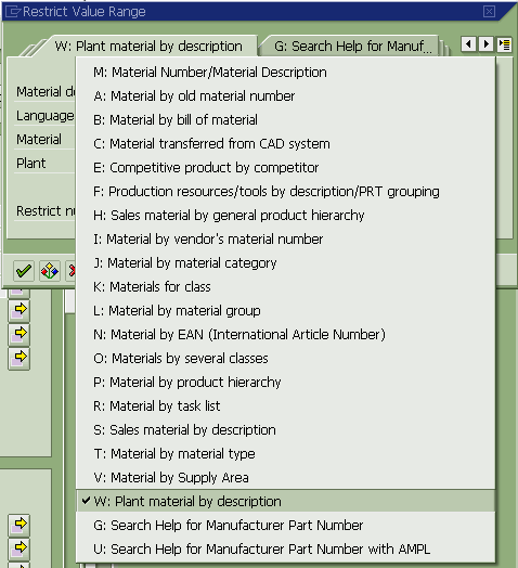 Step 2. Click the top right icon. The system displays a list of all hot keys active for this search help (Figure 3). Choose option W: Plant material by description. I compiled Table 2 to give you information about the hot keys for the elementary search help when the user searches in the Material field, as this information cannot be found in one place.
