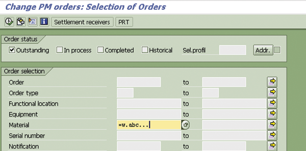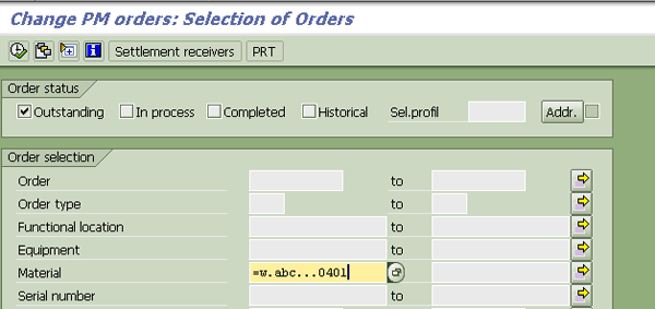 Starting at the Change PM Orders: Selection of Orders screen, enter =w.abc*…0401 in the Material field (Figure 4). Following the convention in my example: