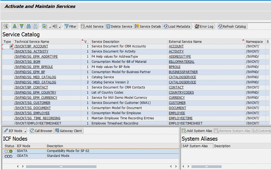 Adding the service to the catalog allows you to activate it so it can be used by the applications trying to access it. To activate the Gateway Service, select the service you want to add in the service catalog. You select it by clicking on it. This opens the service’s properties, shown in the bottom of Figure 1. On the right you see which System Alias is configured for the service. Make sure this box is not empty as the service requires a System Alias to be attached to it. If the current system is to be used, then the System Alias is most likely LOCAL. If another system is to be used for the Gateway service, ask your Basis team for more information. On the left you see the Status of the service. Here is where you can activate, deactivate, delete, or configure the service to your needs. To make services accessible to the external applications, just activate them.