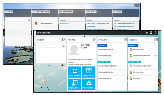 When ESS and MSS were offered through SAP, users had to work through the SAP NetWeaver Portal or the SAP GUI to access standard reports, actions, and other relevant services. With the new release of HR Renewal 1.0 it is now possible for employees to see all of their required services on one page and customize the page to fit their needs (Figure 6).