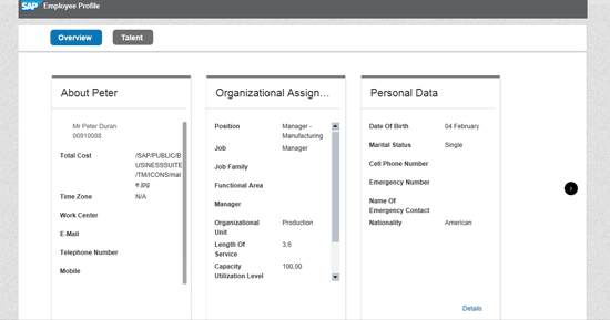 Besides improving the look and feel of the landing page, other components have received the same SAPUI5 treatment. For example, the employee profile page has also been developed using SAPUI5, and the concept of lanes is used again to show grouped information. This layout improves the visibility of the information, giving users a better view of all the data on the screen. In addition, the drag-and-drop functionality of the lanes has been improved to provide a better user experience (Figure 10).