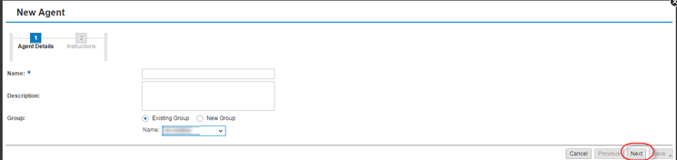 The next step is to create a new agent instance. Click the New Agent link on the right side of the page (Figure 4). Once you click the New Agent link the screen in Figure 5 opens. Here you give the new agent instance a name and a description and assign it to a group (either new or existing). By default the group name is the organization name. You can create a new group if you wish. When you’ve completed your entries, click the Next button.