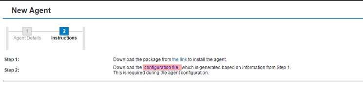 In the next screen that opens (Figure 6) you can see two steps. You have already completed Step 1—downloading the agent. Now you have to finish Step 2—download the configuration file to the local server system. Download the file now and keep it—this configuration file is needed later.