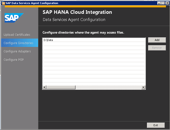 After you’ve made your entries to the screen in Figure 7, click the Configure Directories option on the left. This opens the screen in Figure 8 where you define and add the directories that will be accessible to SAP Data Services on Demand during run time. Any text files kept in these white-listed directories are readable. You can also create files in these directories when doing a write-back from SAP cloud applications. To add white-listed directories, click the Add button and a pop-up screen opens where you can give the path of the directory. Once you close the pop-up screen you can see the directory you just added.
