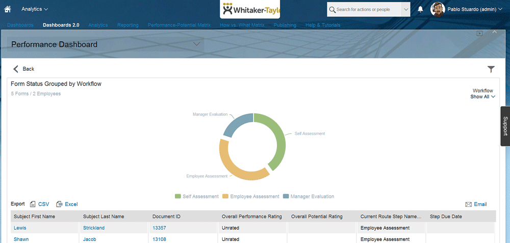 By clicking the chart itself (in this case, the pie chart in yellow and red), you can see the details of the data that created the result (i.e., the chart) displayed at the bottom of the screen. (In this case, the dashboard is reporting on the status of the performance forms.) You can export this data to Excel or in comma-separated value (CSV) format by clicking the CSV or Excel option on the left side of the screen.