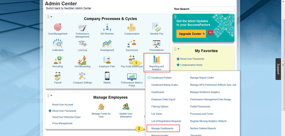 The details about the Upgrade Center and enabling new functionality in SuccessFactors are outside of the scope of this article. However, in this section, I provide general instructions for accessing the Upgrade Center to upgrade to Dashboards 2.0 Reports.