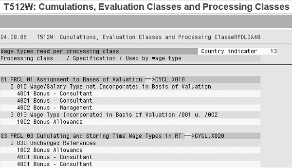 Figure 3 is the output when you choose processing classes. Double-click on the processing class specification (any line under the highlighted processing class name) for results of all wage types with that specification. In this instance, you are examining all wage types with a particular processing specification. For example, if I click on the line with value 3, I will see all wage types that make up my valuation bases 01 and 02. When you double-click on a specification from Figure 3, you see the screen in Figure 4. This screen shows all wage types with the processing class set to specification 1.