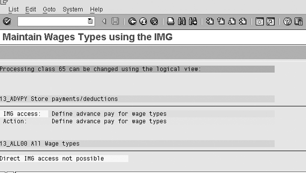 To display the IMG steps to configure the characteristic of the wage type that the cursor is on, click on the Logical view button shown in Figure 3. Double-click on the IMG access line labeled Define advance pay for wage types to go to the IMG (Figure 5). This brings up the pop-up window that Figure 6 shows. Click on Continue w/o Specifying Project to go to the IMG (Figure 7). You can now configure processing class 65.