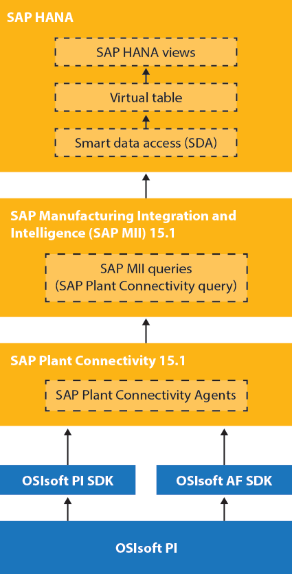 SAP MII supports different types of SAP Plant Connectivity queries (Tag Retrieve, Tag Aggregates); this enables retrieving data for analog or digital PI tags from an OSIsoft PI system with different functions (e.g., Plotvalues, Interpolation, Last Recorded, or Dynamic Aggregates). These different types of SAP MII queries can be used as virtual tables in SAP HANA and thus enable great use cases for analyzing data from OSIsoft PI in SAP HANA.