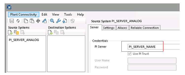 Figure 4 opens where you specify the server name of the OSIsoft PI server in the PI Server field. This option is available once the source system type is selected. SAP Plant Connectivity supports PI Trust or User Name/Password as authentication mechanisms to the OSIsoft PI system.