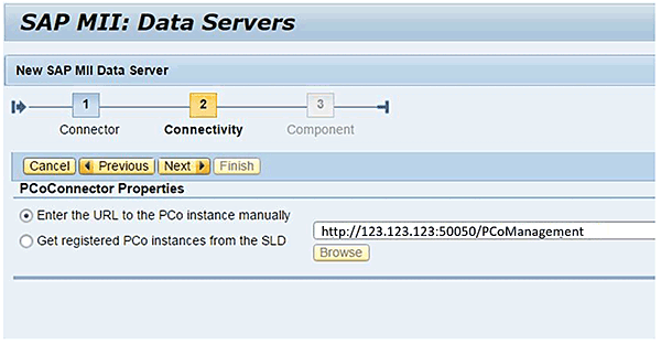 Figure 9). Specify the name of the SAP MII data server and select PCoConnector as the Connector Type. Click the Next button to get to the configuration step to specify the PCoConnector web services URL.