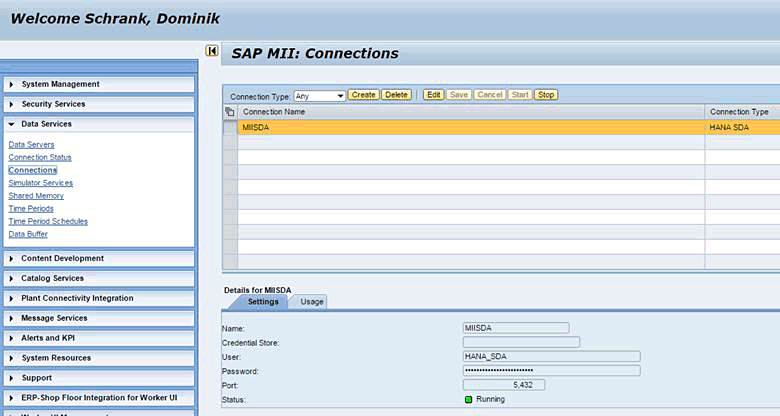 Next, to configure the technical connectivity to SAP HANA a new SAP HANA smart data access connection must be created in the SAP MII web application. Select the Connections function in the Data Services group in the SAP MII: Connections screen (