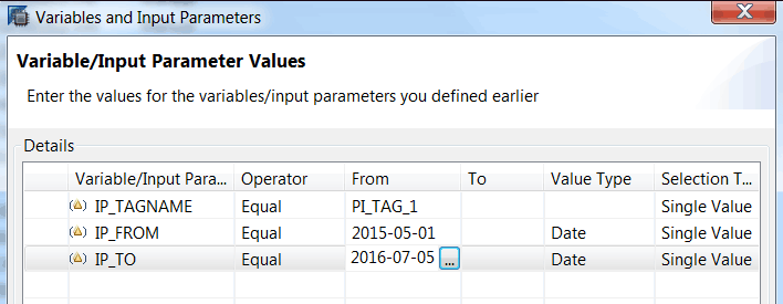 I have configured three input parameters in the SAP HANA calculation view: the IP_TAGNAME (OSIsoft PI tag name) and from and to dates (IP_FROM; IP_TO). These input parameters are used to set the filter for the SAP MII query.