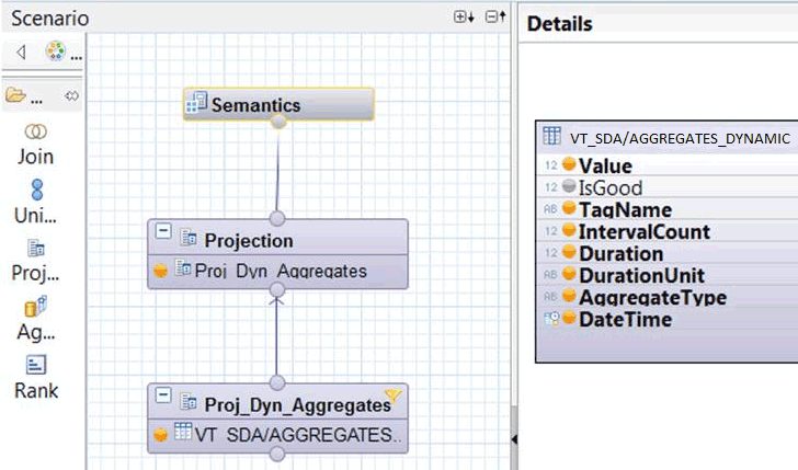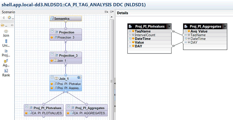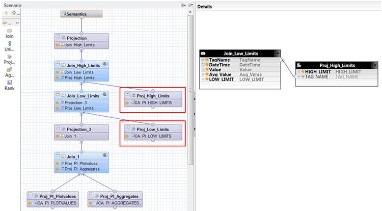 To demonstrate this option, the SAP HANA calculation view from the previous section is extended by two Projection nodes that include an SAP HANA table that holds the high- and low-limit information for PI tags. This information can be joined in the existing SAP HANA calculation view.