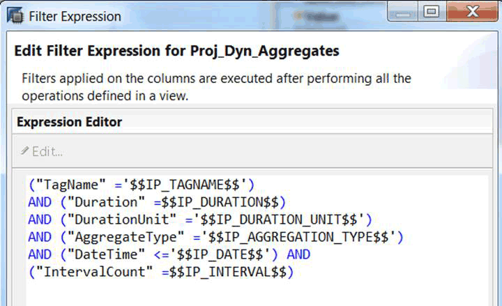 After setting the virtual table in a Projection node in the SAP HANA calculation view, you can specify the filter options. Like the SAP HANA calculation view in the previous section, filters on the TagName, IntervalCount, Duration, and DurationUnit are required. Additionally, specify a filter on the AggregateType. The type of aggregated values that you want to retrieve from the OSIsoft PI system is specified in this field. Possible values are, for example, AverageTW, Min, or Max.