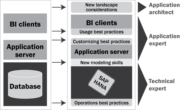 We’ll break up the description of the new skills into three sections as we see the following three expert profiles primarily affected by the introduction of SAP HANA (Figure 1):