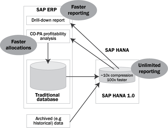 One of the first accelerators introduced by SAP is the CO-PA Accelerator with SAP HANA. The accelerator focuses on a CO-PA-based profitability analysis scenario, enhancing its reporting and application performance dramatically while remaining within the user interface of SAP ERP. Figure 5 shows the architecture for this accelerator.