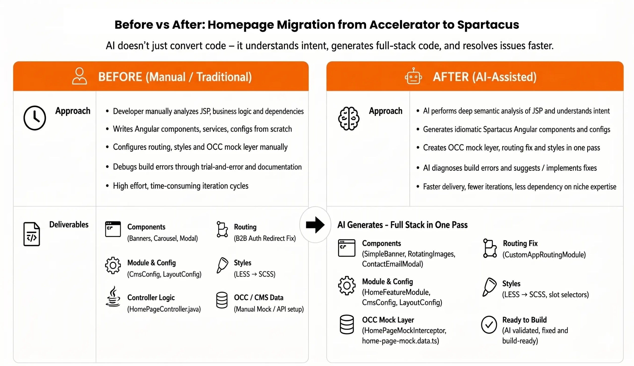 Migrating the homepage from SAP Commerce Cloud Accelerator to Spartacus uses AI-assisted analysis to extract UI intent from JSPs and map it to API-driven Angular components.