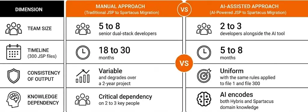 For many organizational teams, this raises a big concern. You may have hundreds of JSP pages, many custom controllers, and years of business logic built into addons. Traditionally, the approach has been to hire specialized developers, spend 18–30 months rewriting everything, and invest heavily in the process. While this works, it is slow, costly, and depends on rare skill sets.