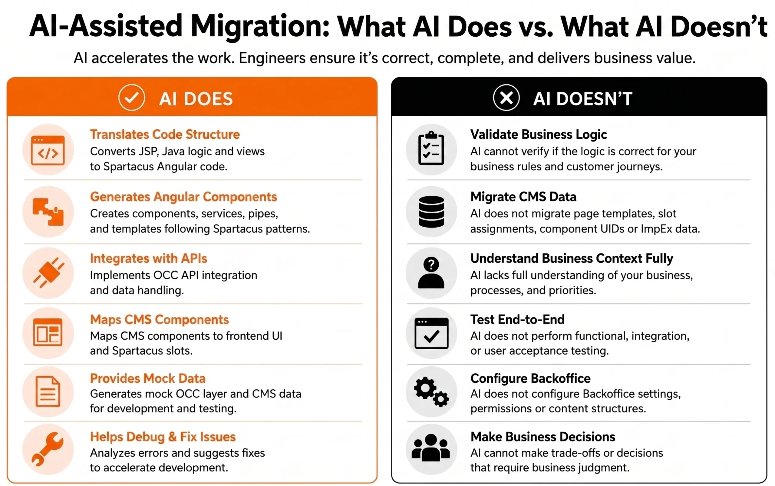 We want to be precise about this, because the hype cycle does nobody any favours. AI-assisted migration is not autonomous migration. It is a powerful accelerator that still requires qualified engineers at the wheel.