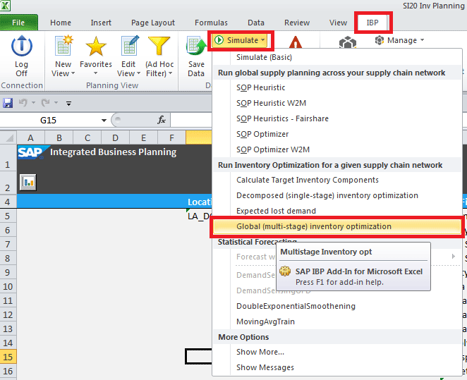 Simulate an inventory optimization run. In the Integrated Business Planning tab, choose Data Input and then Global (multi-stage) inventory optimization from the Simulate drop-down list (Figure 19).