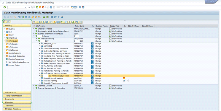 In this step you create aggregation levels in transaction code RSA1. RSA1 gives you access to a data warehouse modeling cockpit where you can create your own InfoAreas, InfoObjects, and InfoCubes, based on which you then can create aggregation levels. This is also a core transaction from which you can create and manage BI transports. As you can see in