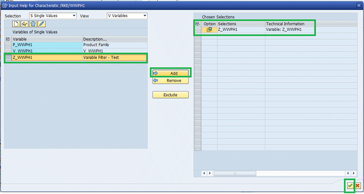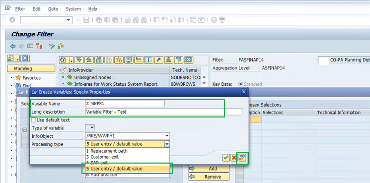 Figure 10, variables have been created and assigned to each InfoObject. By doing this, you restrict the characteristics to certain values, intervals, or hierarchy nodes so that users have access to only relevant datasets. SAP-delivered variables start with /ERP/, but user-defined variables do not follow this format. For example, P_WWPH1 is a user-defined variable filter for the InfoObject /RKE/WWPH1. These filters can be used to restrict data during reporting, analysis, and planning.