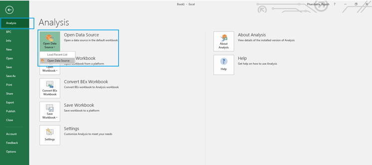 Figure 26 shows how you can access the add-in. The add-in can be accessed either via the File menu of Excel or the menu bar option Analysis. After opening a blank new Excel file, go to File >Analysis > Open Data Source OR open an Excel file and go to Analysis (menu option) > Insert Data Source to open a BEx query via the Analysis add-in.