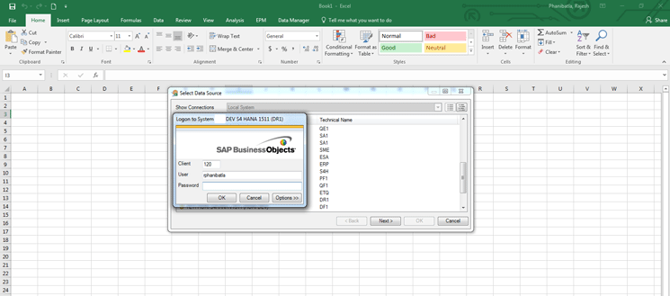 Click the Open Data Source button to log on to the SAP S/4HANA back-end system. This action displays the SAP connections on the Logon to System pad (