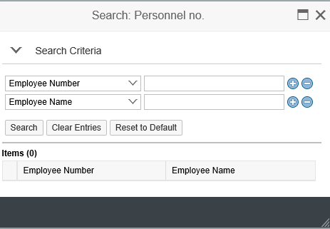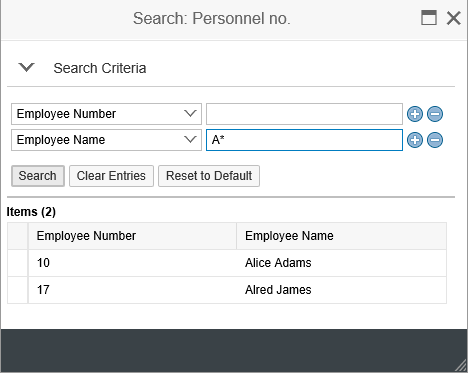 First, provide an OVS for the Employee input field. After you choose the OVS help, a set of input fields is provided for Personnel Number and Name (each showing *). You can choose to view all applicable personnel numbers and names using *, or you can search numbers and names using a certain section’s criteria. Based on the criteria you choose, a number of values may appear in the result set. After you select a given entry, the input fields Employee Number and Employee Name are populated.