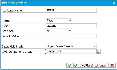 4. Specify the context attributes within the view pertaining to the employee number and name. In the main view, right-click the Context node. From the context menu choose Create > Attribute options. For example, give a name to the attribute with the type PERSNO. Most importantly, select Object Value Selector from the options in the drop-down menu in the Input Help Mode field, as shown in Figure 11. In the OVS Component Usage field, select the OVS using F4 help.