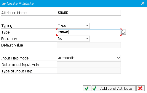 Then press Enter. Now create another attribute with the name Employee Name and abbreviate it as ENAME. In the Input Help Mode field, select Automatic from the drop-down list of options, as shown in Figure 12.