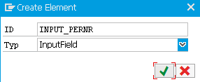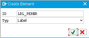 Now enter LBL_PERNR in the Name field, select Label as the type, and then click the green checkmark icon to move on. Create another user interface (UI) element with the name INPUT_PERNR and specify InputField as the field type (Figure 14).