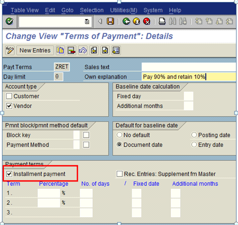 First you configure the payment term using transaction OBB8 or by following menu path SPRO > SAP Reference IMG > Financial Accounting (New) > Accounts Receivable & Accounts Payable > Business Transactions > Incoming Invoices/Credit Memos > Maintain Terms of Payment. Create a new entry. For example, ZRET is the proposed name for the retention invoices because other payment terms may exist. For the payment term, do not forget to select the Installment payment indicator (field XSPLT). You define the description of this payment term ZRET as Pay 90% and retain 10% (
