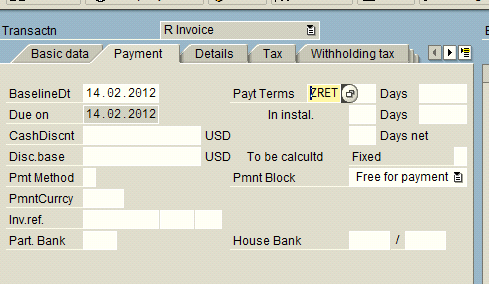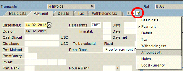 Figure 10), you have payment terms ZRET by default through vendor master data. It is not important that you have ZRET payment terms. It can be 0001 (immediate) in the Payment tab. This field is hidden as soon as you complete the Amount split tab.