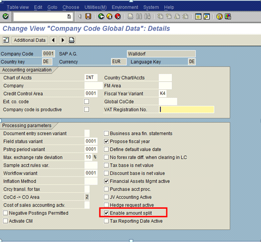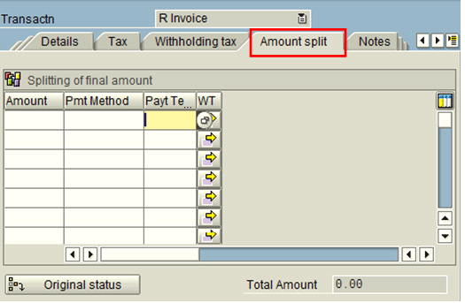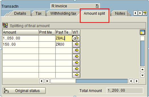 You can meet other business requirements if you activate the Enable amount split indicator in FI global settings. A common business requirement is to split a vendor invoice into two sales tax codes. Users may want to split a vendor invoice and pay through two different payment methods. Both these requirements can be achieved using enable amount split.