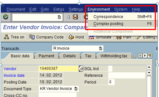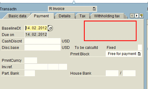 The first step in the vendor invoice is to complete the header portion. After completing the Basic data tab information, click the Payment tab as shown in