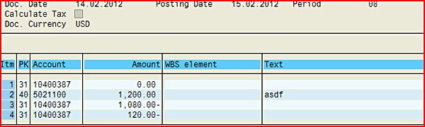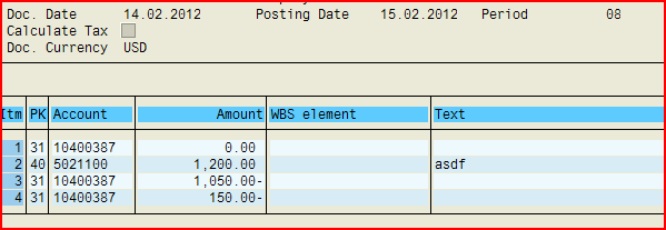 Once you are done with the double entry, simulate the accounting document before posting it. (When you complete the GL account in the line item part, it becomes a double entry. The header part is the vendor that is credited, and the line item part is the GL account that is debited.) The system splits the amount into two lines. While you are simulating the accounting document, you also see one more line with a zero amount as shown in