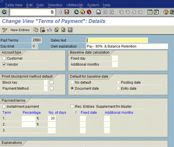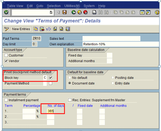 Now configure two more payment terms: ZR10 (for 10 percent) and ZR90 (for 90 percent). When you configure ZR10, put the payment block so that the system prevents the 10 percent amount from being paid. The payment block is set by default for that line item when you post a vendor invoice. If you have the requirement that the item should be due in 365 days, then maintain the No of days (due) field. If the item has no due days, leave this field blank. Users have to unblock the line item manually when the payment is due. If the invoice was posted through Logistic Invoice Verification using transaction code MIRO, then users can unblock invoices in one shot using transaction code MRBR. However, if the invoice was posted through FI-AP, then the user has to manually call each document and unblock the items. The point to remember is that the system does not unblock any blocked item automatically on its maturity (i.e., when the payment is due); the user has to unblock it. You need to get the requirements from the business (