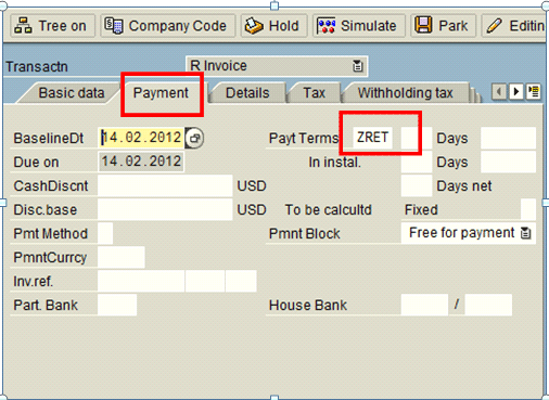 Enter payment terms ZRET or the payment term can be defaulted through vendor master data (if it is defined in the vendor master data). After completing the header section, you complete the line item part as required.