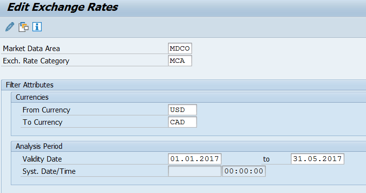 Market data exchange rates, which are obtained from sources such as Bloomberg and Reuters, can be viewed by executing transaction code /BA1/F4_FX_03.