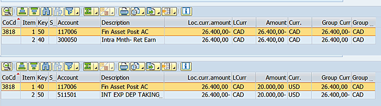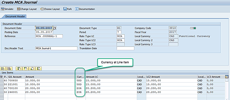 The key advantage of the MCA Document Journal posting screen is having the currency key in the line item level. For example, a bank that is lending foreign currencies and generating daily interest incomes from multiple foreign currencies can use the MCA journal transaction to book the interest income against all the lending currency through one MCA document, as against multiple documents per transaction currency through the regular FI-G/L journal.